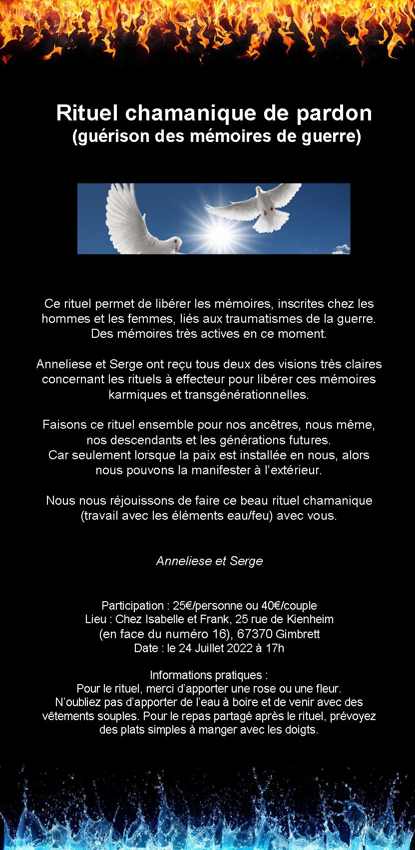 Anneliese et Serge ont reçu tous deux des visions très claires concernant les rituels à effecteur pour libérer ces mémoires karmiques et transgénérationnelles.